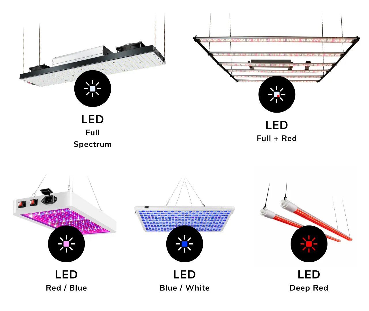Choose “LED Deep Red” if your grow light uses only deep red LEDs (around 660 nm wavelength). These lights are often marketed as "deep red spectrum" or "red spectrum supplemental lights" and are commonly used as boosters during flowering stages.