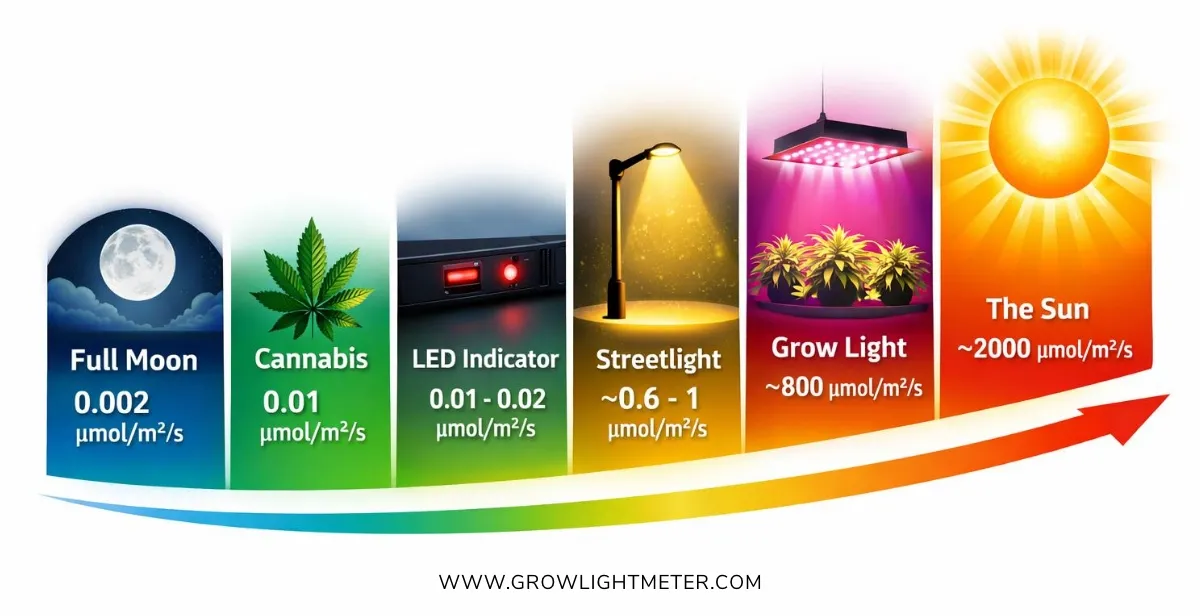 Darkness is not only about duration—it also means keeping light levels extremely low throughout that time. The acceptable intensity thresholds also vary by species. As a natural reference, full moonlight shows PPFD levels of roughly 0.002 μmol/m²/s, which is already close to the threshold where particularly sensitive plants begin to react.